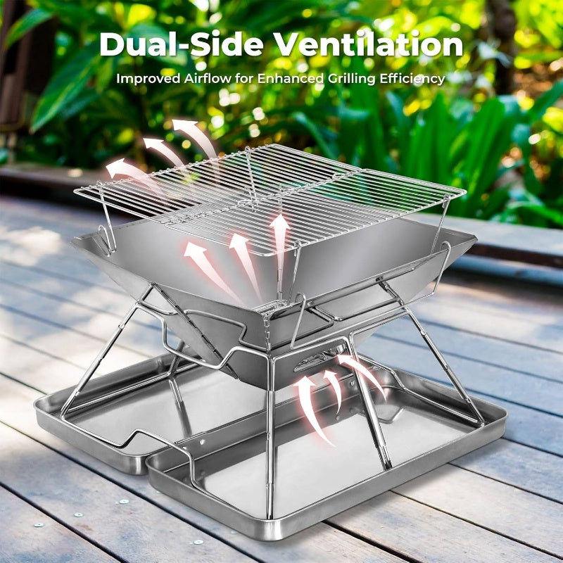2-in-1 Portable Camping BBQ Grill | Stainless Steel Foldable Collapsible Charcoal Grill