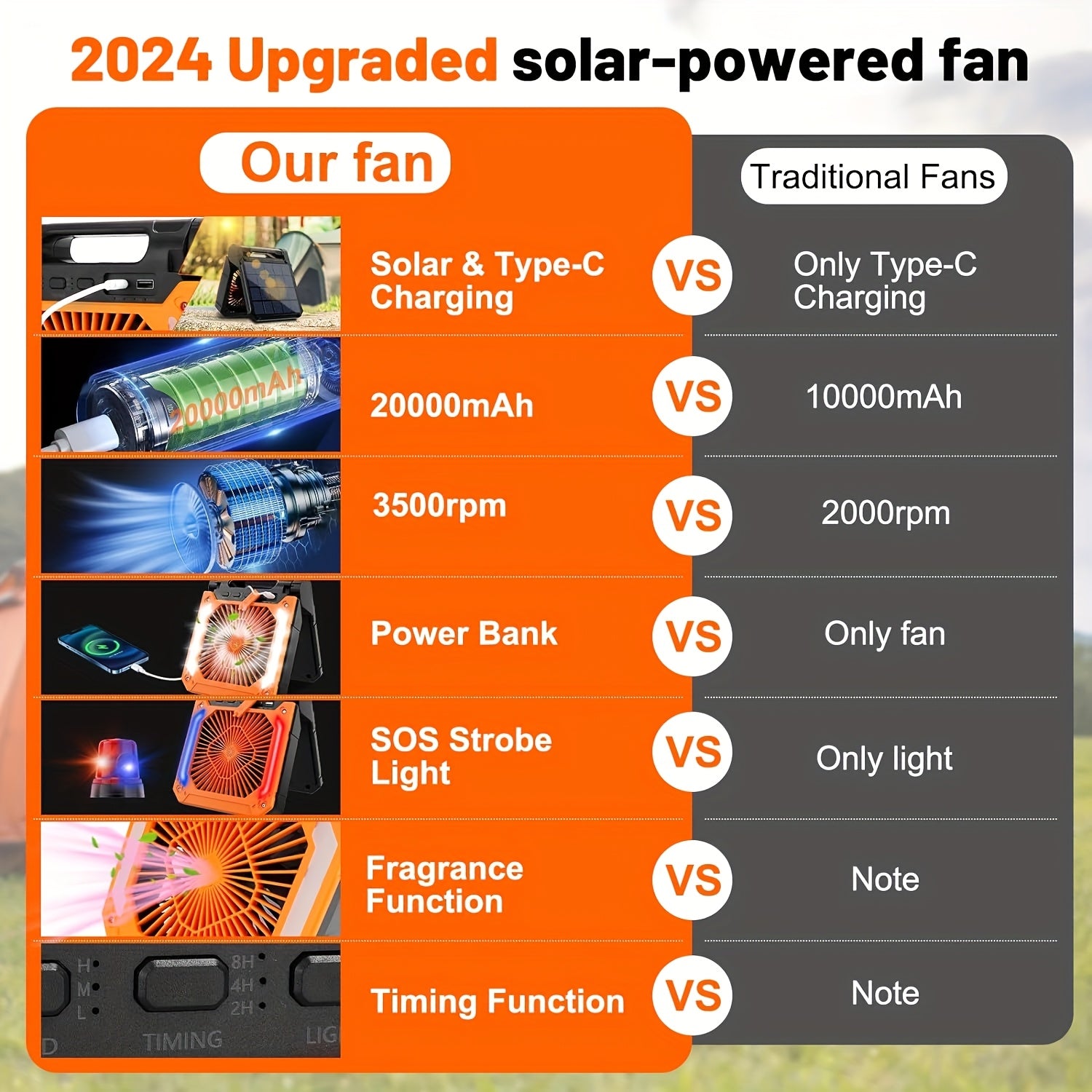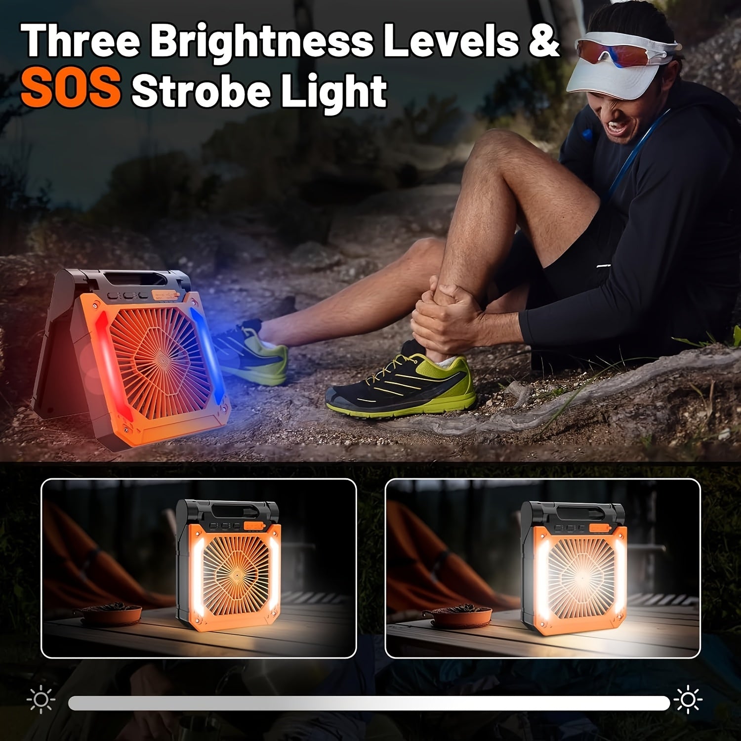 Stay cool and charged up wherever your adventures take you! This ingenious 20000mAh solar-powered camping fan keeps you comfortable in any environment with three adjustable speed settings. The built-in LED lighting and SOS strobe function provide reliable illumination for nighttime camping or emergency situations, while the USB charger port lets you power up your devices on the go. Its compact, foldable design makes it perfect for backpacking, beach trips, office breaks, or home use. Solar-powered charging means endless energy from the sun, backed by a rechargeable battery for cloudy days. Lightweight, versatile, and ready for anything—your new camping essential just arrived!