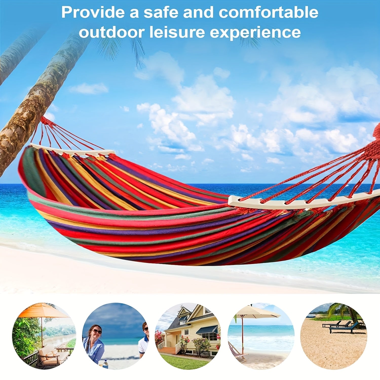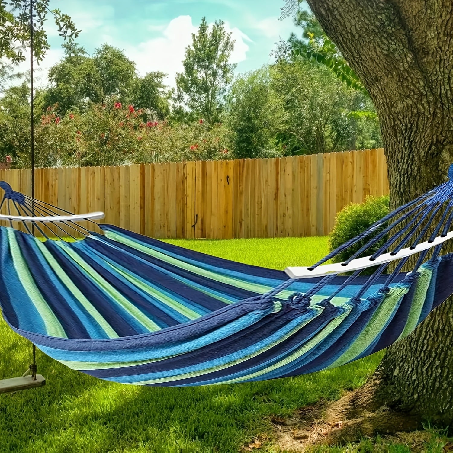 Escape to your happy place with this ultimate double hammock setup! Perfect for two, this portable camping companion comes fully loaded with everything you need for relaxation anywhere. The included inflatable U-shaped pillow and eye mask with earplugs transform any outdoor spot into your personal retreat. Sturdy anti-tip gourd buckles, D-ring straps, and tie ropes ensure secure setup, while the curved pole tripod means you're not hunting for trees. Pack it all into the convenient canvas storage bag and you're ready for adventure. Whether you're glamping or genuine camping, this hammock delivers comfort without the fuss.