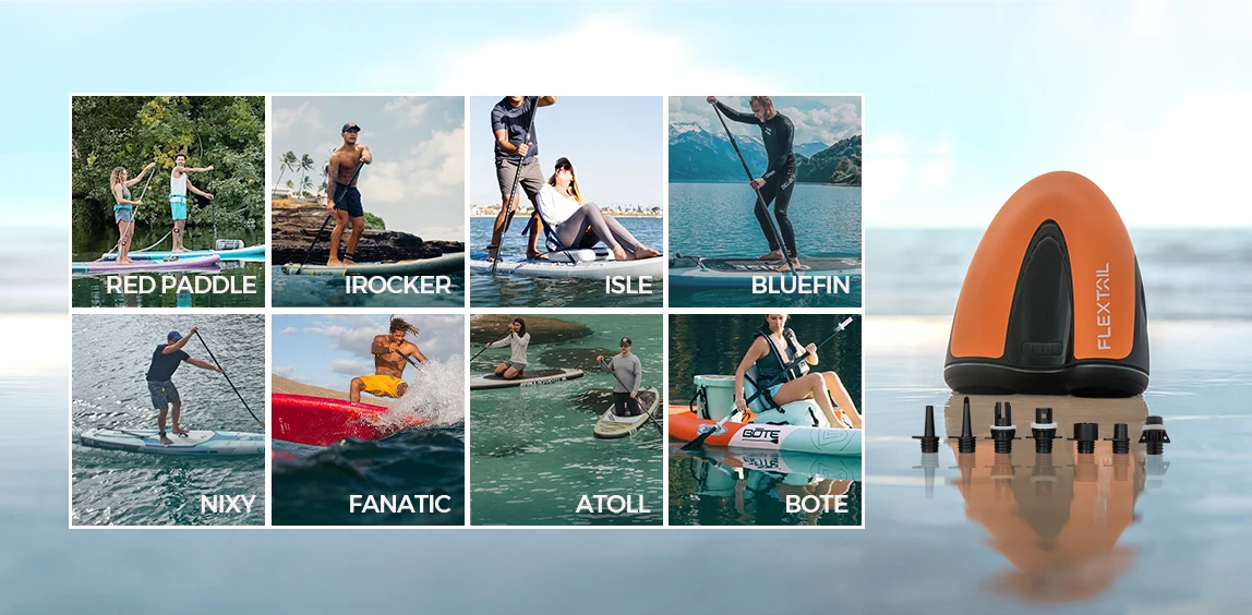 6 nozzles is suitable to SUP brands including Board Red Paddle, IRocker, ISLE, Bluefin ROC, Nixy, Fanatic, Atoll, Bote Body Glove, Peak, Dynamo, Fanatic, Hero Hydro-Force, Advanced Element, Penguin, Thurso Blackfin, Focus Hawaii, Sea Lion, Newport Vessels SUP-YAK, SCOUT. Also, you can also use it on other inflatable products, such as swimming pools, tents, etc.