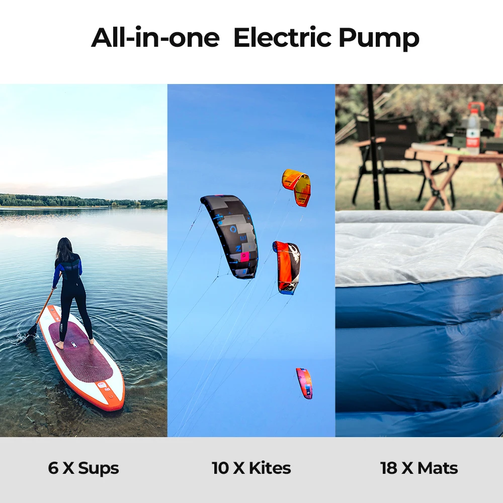 Equipped with 8000mAh rechargeable battery, it enough to pump up 6 SUPs or 10 surfing kites or 18 queen sized inflatable mats in a row. No hassles needed.