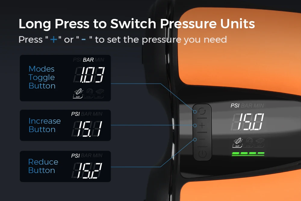 "SUP" Mode: the default pressure is 15 PSI. It is best suited for SUPs and other inflatable products that require pressure up to 15 PSI.