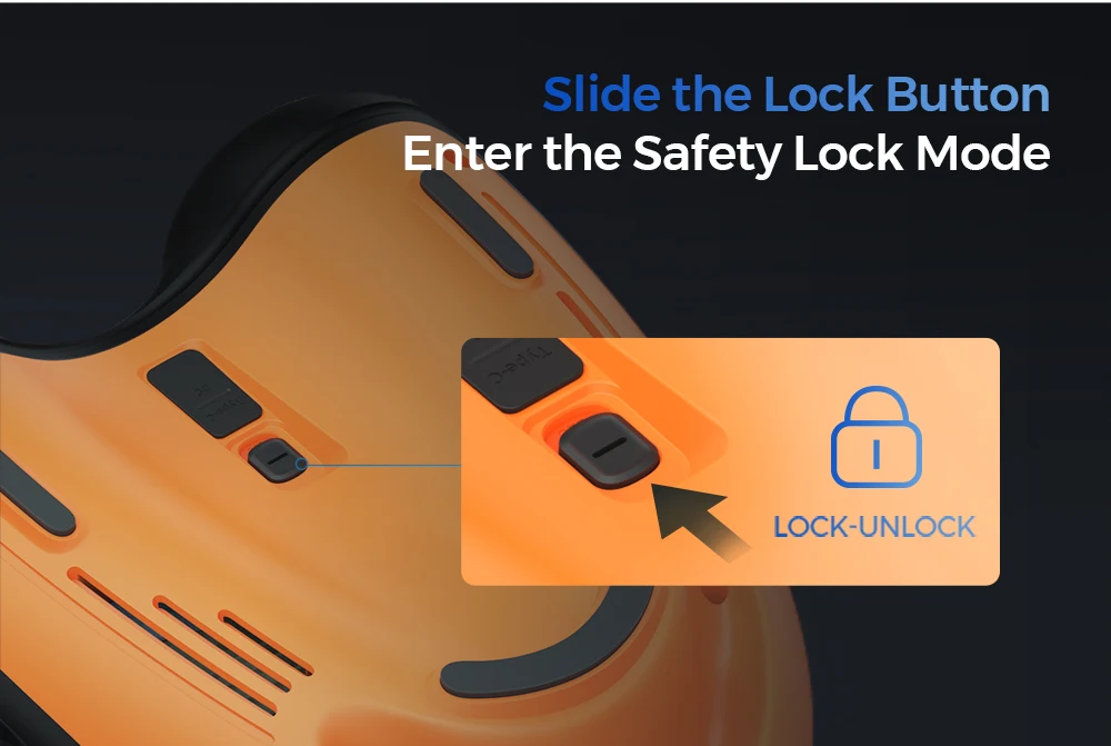 The travel lock design prevents accidental activation of the product while traveling or in a state of non-use. When it is locked, the EVO SUP PUMP will not start.