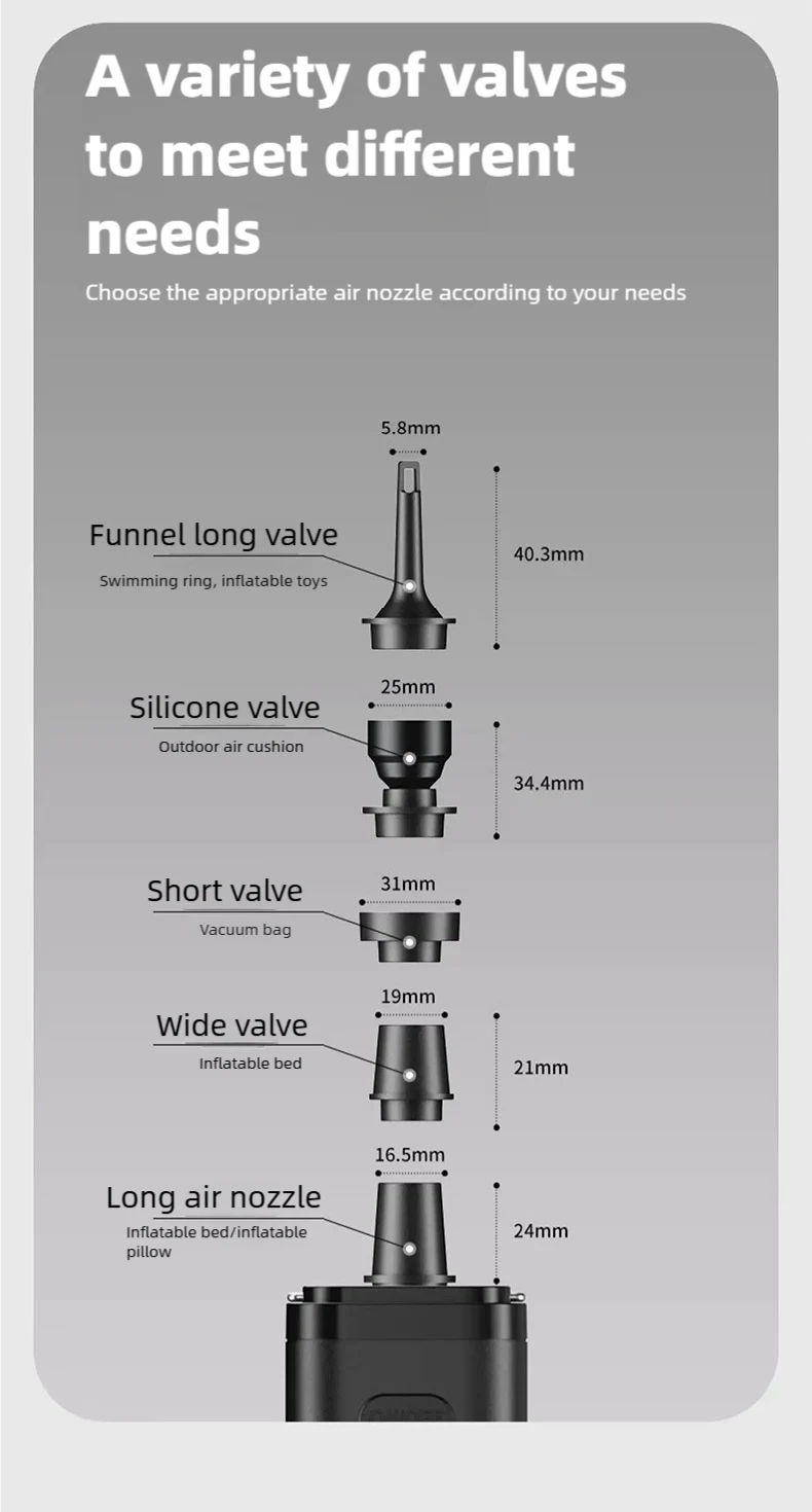 6 Nozzles Included: Fits air mattresses, pool floats, pillows, and more.